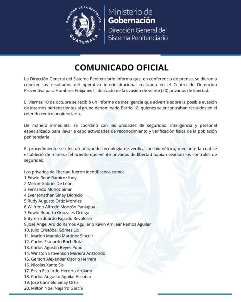 Este domingo 12 de octubre, el director del Sistema Penitenciario (SP), Ludin Astolfo Godínez, confirmó la fuga de 20 reos de alta peligrosidad, integrantes y líderes de la temida Mara 18, que cumplían condena en el Centro de Detención Fraijanes II. Abriendo un nuevo y grave capitulo en la seguridad carcelaria en Guatemala.