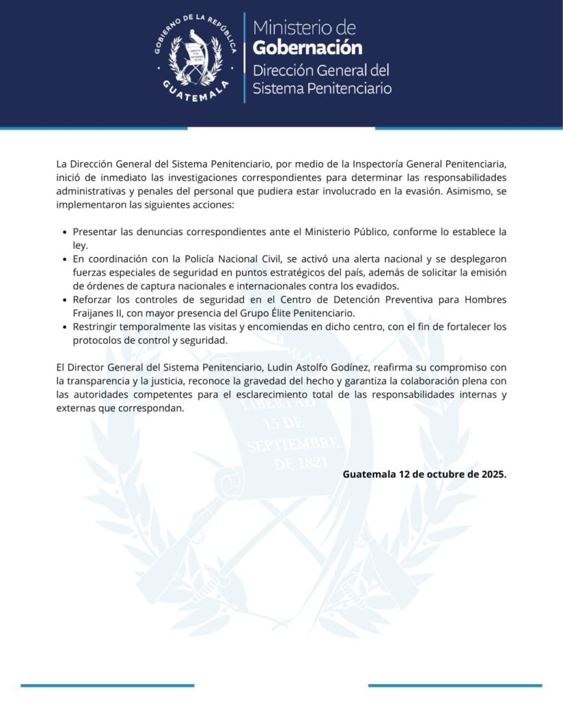 Lo que sí afirmó Godínez con contundencia es que no se trató de un escape improvisado. “Esta es una evasión de la justicia. Los privados de libertad evadieron los sistemas de control, registro y seguridad. Pudo haber participación del personal administrativo que tenía a su cargo la custodia de los reos. Eso no lo vamos a descartar”, detalló el director, señalando que la fuga fue planificada con tiempo y con posible apoyo desde adentro de la institución.